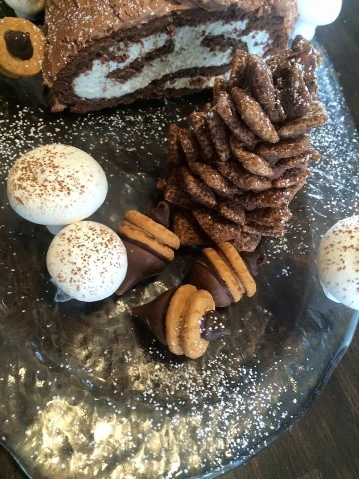 For the cake part of the design, I chose to do a chocolate cake roll filled with sweetened whipped cream and frosted with chocolate buttercream. I took great joy in making the frosting look like tree bark.