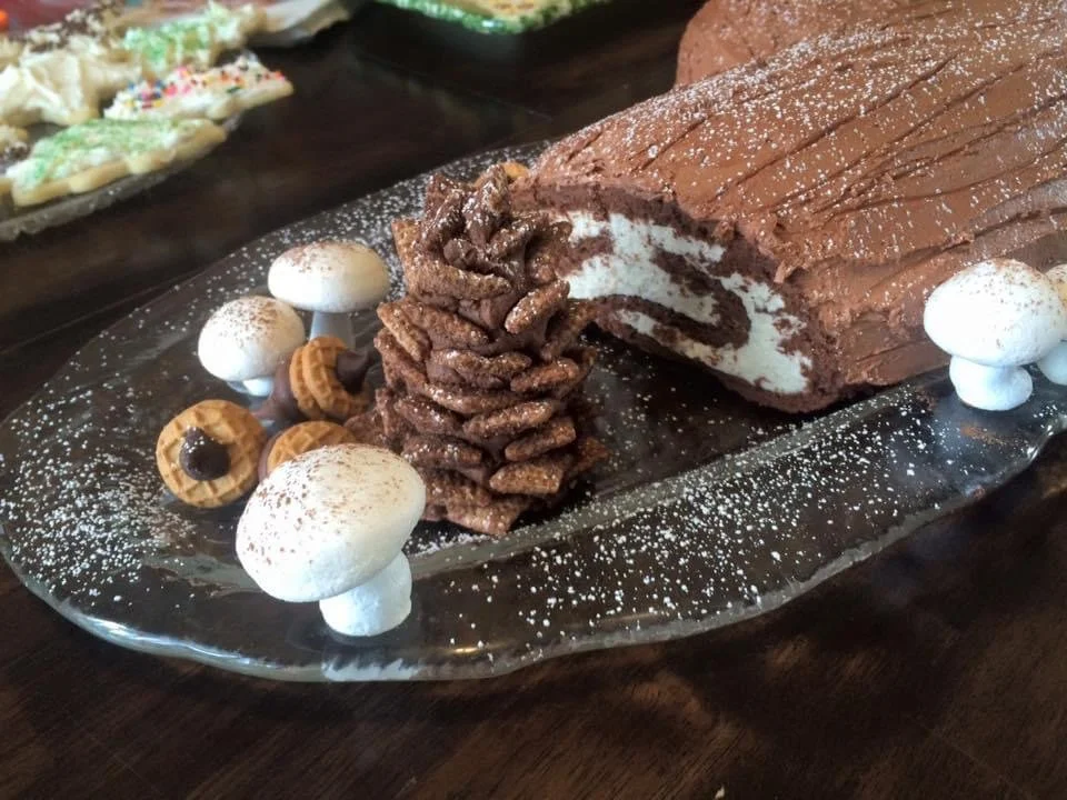 For my Yule Log project, I chose to decorate with only things that are both edible and delicious. Many Yule Logs get decorated with actual sprigs of holly leaves, sugared fresh cranberries, or twigs of rosemary. No, thank you. Meringue mushrooms, yes! I also searched and found adorable edible acorns made out of cookies and candy and pinecones made out of fudge and cereal. I now had a plan.