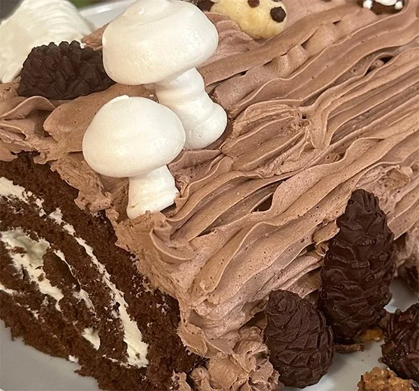 The frosting was piped on using a large star tip to look like a very old log with craggy bark and knots. Beautiful! Plus, a thick layer of frosting helped keep the decorations in place.