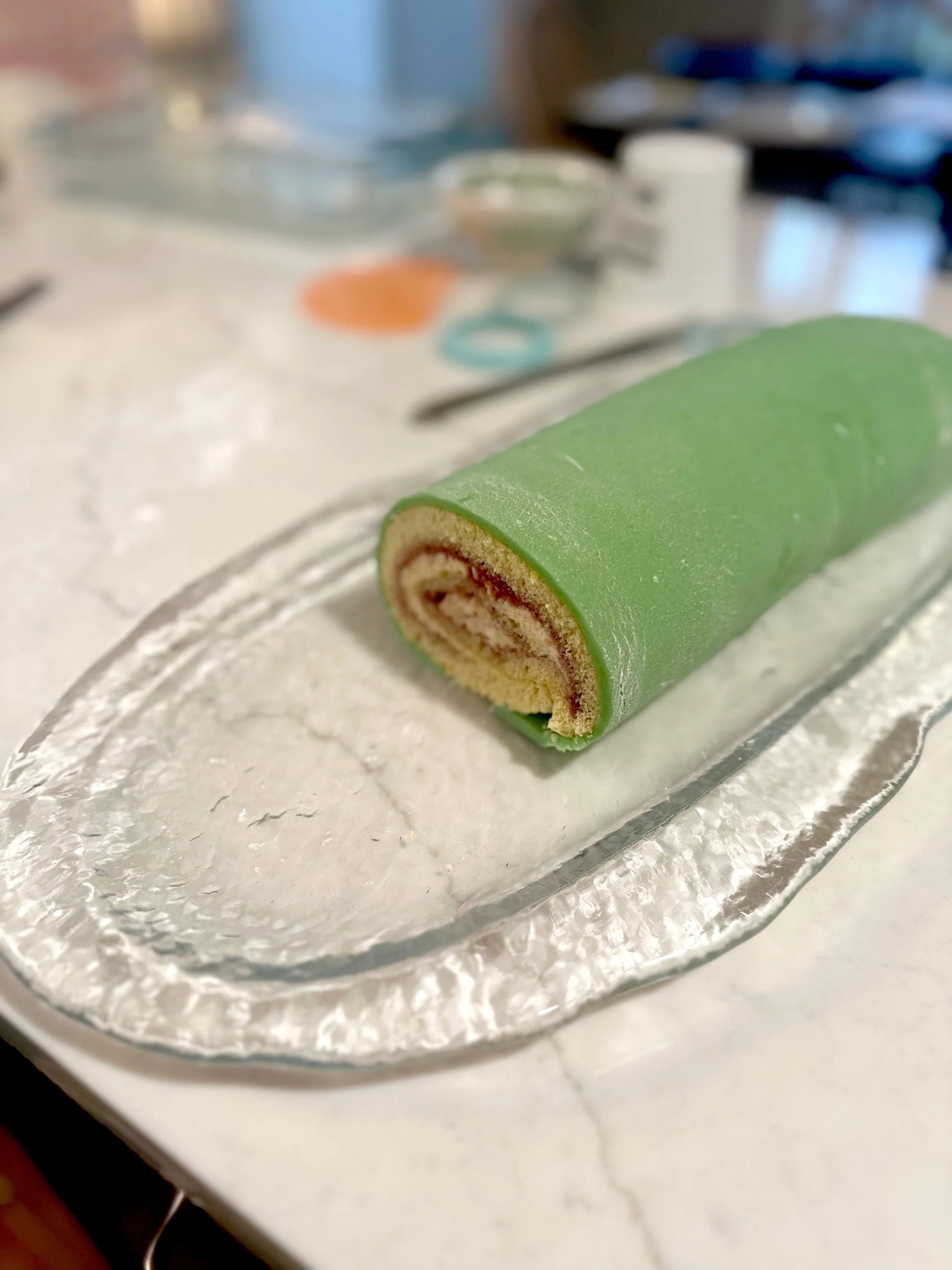 I wanted to incorporate all the elements of the Princess Cake into my log. The light green marzipan covering the cake is essential, but I knew I could replace the pink flower that traditionally tops the dome to make it more “yule” and add other wintry elements. I decided my Yule Log would have a festive green, red, and white color scheme while staying true to the delicate and elegant vibe of the original cake.